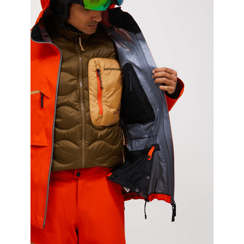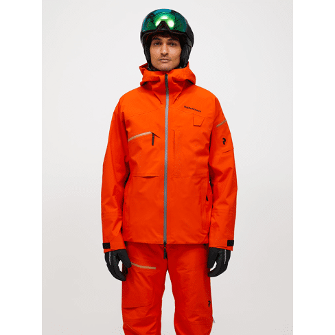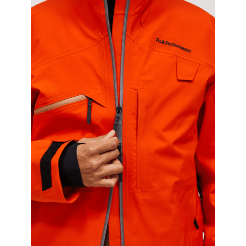 - Kenmerken: Volledig gesealde naden, vaste skihelm-compatibele capuchon met Cohaesive™ koordverstellingen en gelamineerde rand, 2-weg YKK AquaGuard® ritssluiting aan de voorkant, zichtbare YKK AquaGuard® ritsen, ritsventilatie onder de oksels, ritszakken voor handen, borst, skipas en binnenin, radiozak met antennepoort, verstelbare zoom met trekkoord, verstelbare klittenband manchetten, elastische polsgaiters met duimgaten, verwijderbare sneeuwvanger met snap-in broeksysteem, brillendoekje, RECCO® Rescue System reflector, voorgevormde mouwen, GORE-TEX stretchpanelen in capuchon en bovenrug, ophanglus in kraag, Peak Performance borduursel op borst, P-logo rubberen badge op mouw