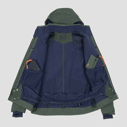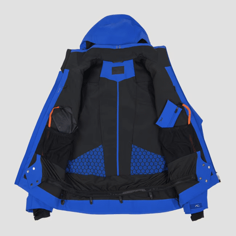 - Kenmerken: KJUS AC-Vent™ ventilatiesysteem op onderarmen, graphene-gevoerde telefoonzak, KJUS Fast Thermo Core™ isolatie met graphene, geborstelde nekbeschermer, verstelbare sneeuwvanger, 3D-technologie voor mobiliteit