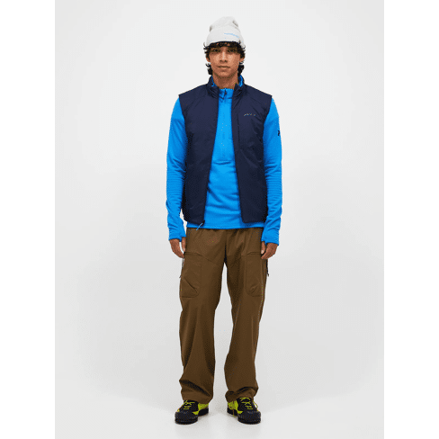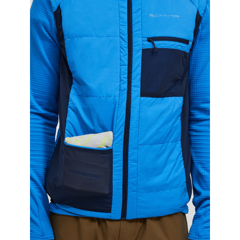 De Peak Performance Freelight Reversible Insulated Vest Men is een veelzijdig, technisch kledingstuk uit de Freelight-lijn, ontworpen voor lichtgewicht warmte en bescherming tijdens skiën, wandelen, fietsen en dagelijkse avonturen. Met PrimaLoft® Silver isolatie (40 g/m²) biedt dit vest (0,285 kg) uitzonderlijke warmte zonder extra volume, terwijl 2-way stretch zijpanelen zorgen voor comfort en onbeperkte bewegingsvrijheid. Het ontwerp met dubbele stof omvat een lichte 90D stretch poplin (102 gsm) en een 20D platgeweven stof (43 gsm), beide winddicht en waterafstotend voor lichte regen. De volledig omkeerbare constructie biedt twee verschillende looks en zakindelingen, met ritszakken voor handen, borst, interne mesh en binnenzak voor ruime opberging. Ontwikkeld in nauwe samenwerking met atleten en berggidsen, is dit regular-fit vest compact, functioneel en duurzaam, gemaakt zonder opzettelijk toegevoegde PFAS en met gerecyclede materialen. Afgewerkt met een Peak Performance print op de borst en een handschoenlus, is de Peak Performance Freelight Reversible Insulated Vest Men perfect voor freeride skiën, skitouren, trailwandelen of trailmountainbiken.